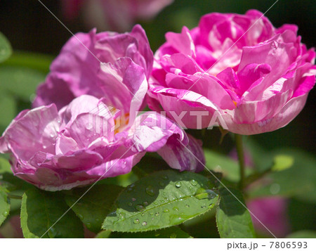 ピンク濃淡の刷毛目模様の珍しいバラの品種「アラン・ブランシャール(1839年、ドイツ)」の花房。