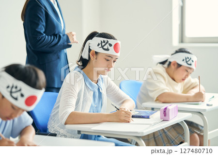 必勝はちまきをして勉強する子供たち