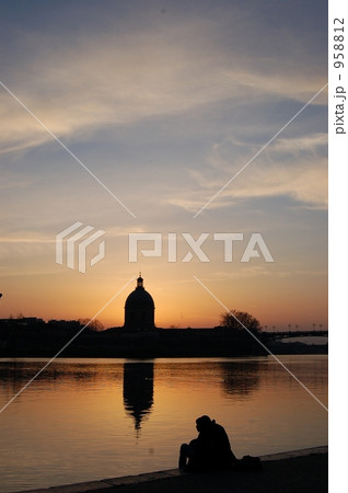 夕焼けに染まるトゥールーズのガロンヌ川と修道院