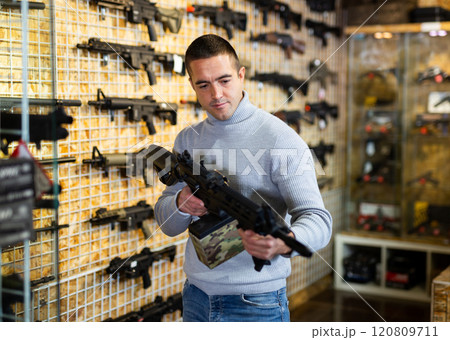 Portrait with adult hunter wearing checked shirt and coat holding shotgun on shoulder after hunting and looking away over nature background
