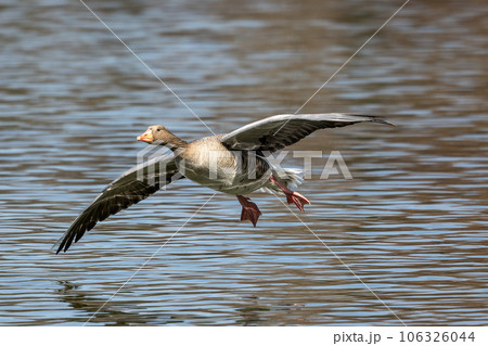 大群で冬に見られる渡り鳥、オレンジ色の嘴と脚が目立つ水鳥の仲間マガン