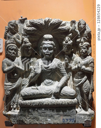 ガンダーラ美術の中心パキスタンのペシャワル博物館に展示される菩薩と供養者の彫刻