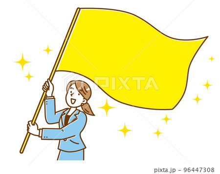 大きな旗を振るスーツを着た若い女性