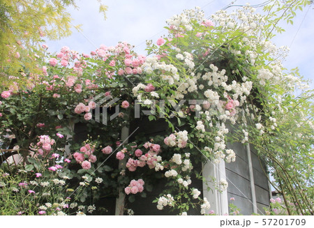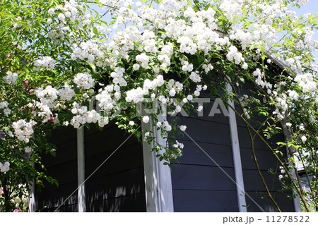 ガーデンシェッドを覆う白いツル薔薇