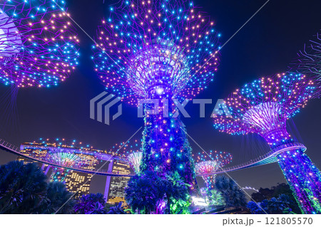 Low-angle view of the Supertree Grove at Gardens by the Bay in Singapore, there is an exhilarating light and musical show at night.