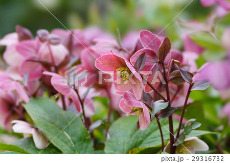 Pink Hellebores flowers grow in spring garden. Beautiful Helleborus purpurascens blooming