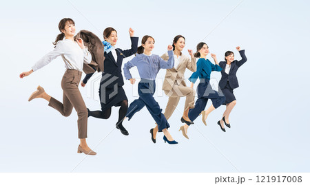 元気にジャンプするキャリアウーマンのグループ 手作業で精密に切り抜いた背景透過全身写真PNG