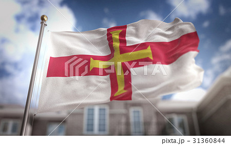 Guernsey Flag 3D Rendering on Blue Sky Building