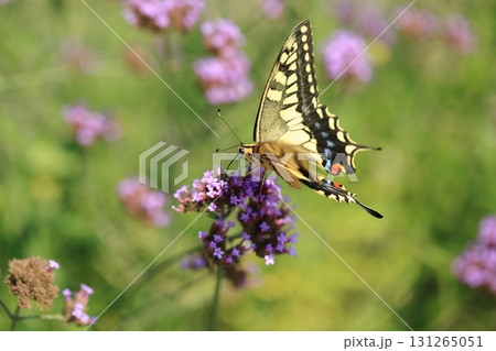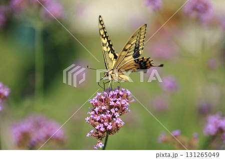 ピンク色の三尺バーベナの花の蜜を吸うキアゲハ