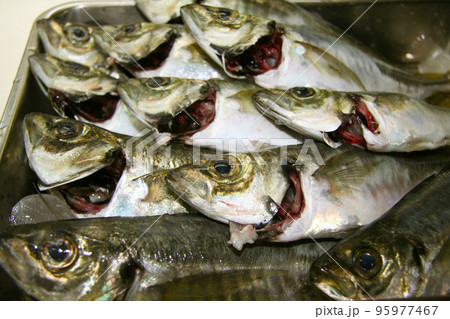 新鮮な金アジたち、下ごしらえを済ませて調理させる前にステンレスバットに並べられている様子。