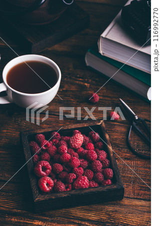 Cup of tea and fresh raspberries