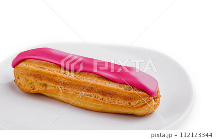 Eclair dessert with pink icing on plate