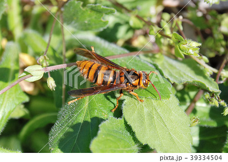 生き物 昆虫 ケブカスズメバチ(キイロスズメバチ)、オスです。長い触角、面長の顔が優しい?