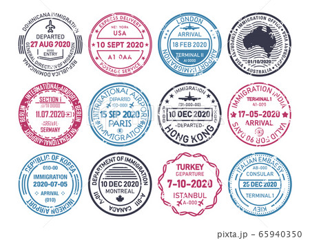 Set of Passport Stamps, Visa Travel Signs. Airport Control, Immigration, International Departure, Arrival Document
