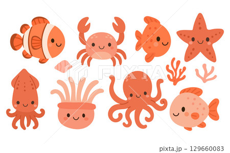 Cute orange sea creatures like octopus, crab, starfish, and squid in a cheerful cartoon style. Perfect for learning printables or beach-themed stories