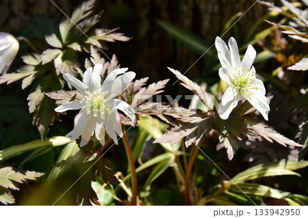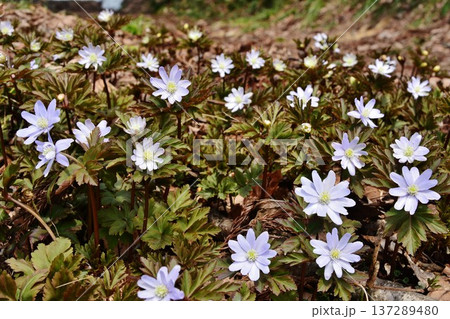 春の花カタクリとキクザキイチゲの花クローズアップ