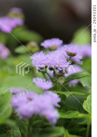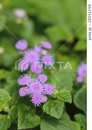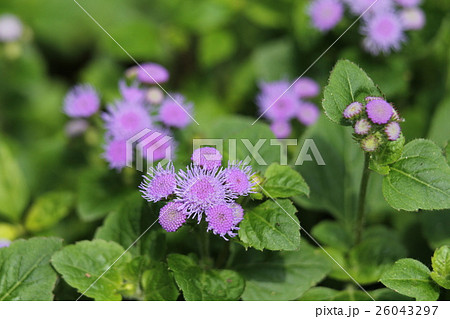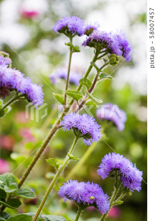 日本の夏の公園に咲く紫色のアゲラタムの花