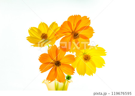 白背景に映える黄色からオレンジ色の四輪のキバナコスモス
