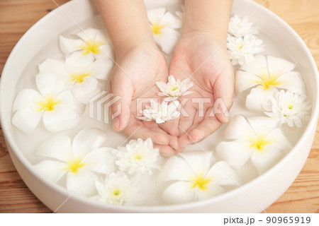 Spa treatment and product for female feet and hand spa. white flowers in ceramic bowl with water for aroma therapy at spa.