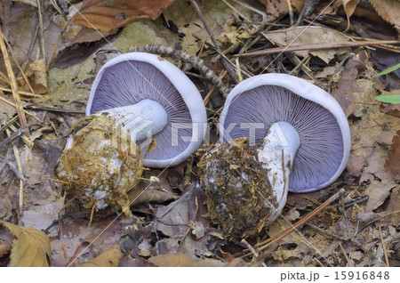 暗茶褐色と対照的にヒダが紫色のウラムラサキシメジキノコ(自然環境下菌・キノコ類マクロ撮影)