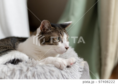 意識して、少し緊張しているキジトラ猫さん。猫のいる暮らし。イメージ素材