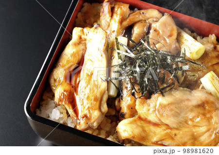タレがたっぷりかかった熱々の炭火焼き鳥重を黒背景で撮影