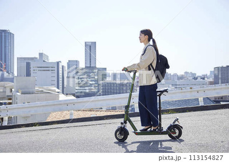 電動キックボードで移動をする日本人女性