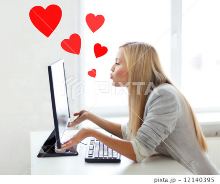 woman sending kisses with computer monitor