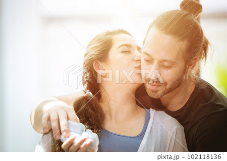 Caucasian beautiful woman hugs her husband