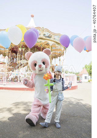 遊園地で風船を持って着ぐるみと並ぶ子供
