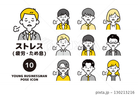 疲れた表情でため息をつく、複数の若い会社員の上半身アイコンセット_ベクター