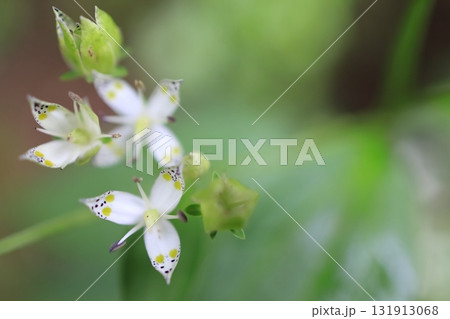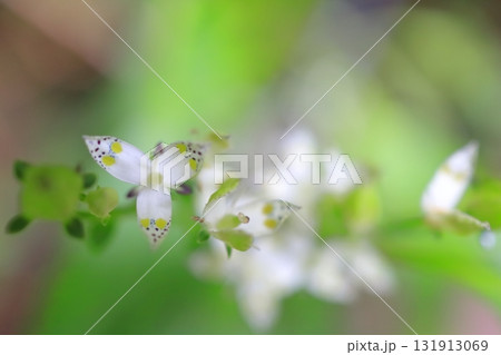 白色の花弁の先端の多数の紫色の斑点と黄色の蜜腺が綺麗なアケボノソウノ花