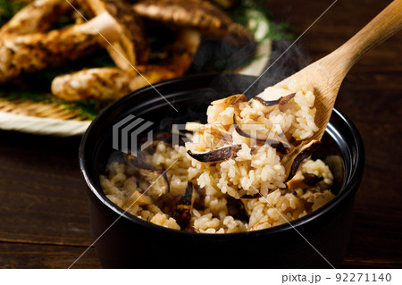 茶碗に盛られた暖かい松茸ご飯と箸のイラスト