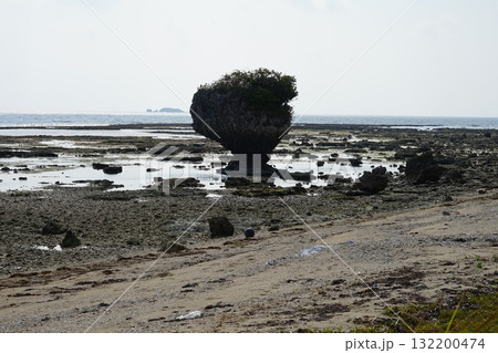 海岸にキノコの形をした岩がある風景 10月沖縄本島311キノコ岩・知念岬公園