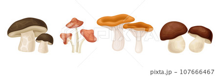 Set of mushroom icons vector. Illustration of boletus, chanterelles, honey mushrooms, champignons, aspen mushroom and russula.