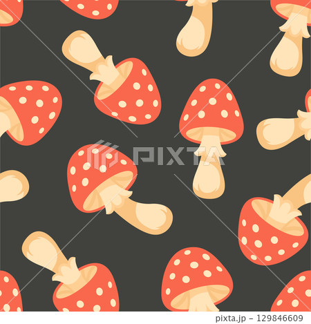 Amanita Mushroom Vector Seamless Pattern. Cartoon Red Amanita Mushroom on Black Background. Forest Background. Poisonous Mushroom Fabric. Amanita Nature Decor, Woodland Print Design