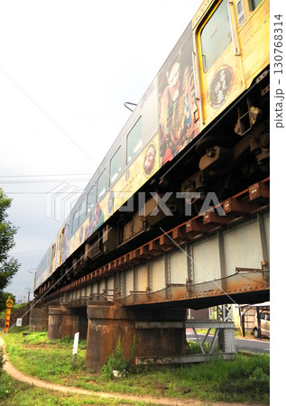 石見神楽のラッピンング列車(キハ126系ディーゼル気動車)が市街地の背の低い橋桁の鉄橋を通過する光景