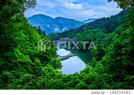 只見線 歳時記橋から望む春の第二只見川橋梁を渡る列車(福島県三島町、5月上旬早朝)