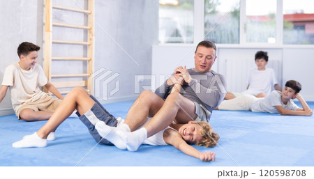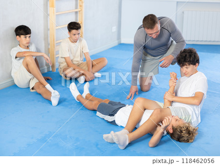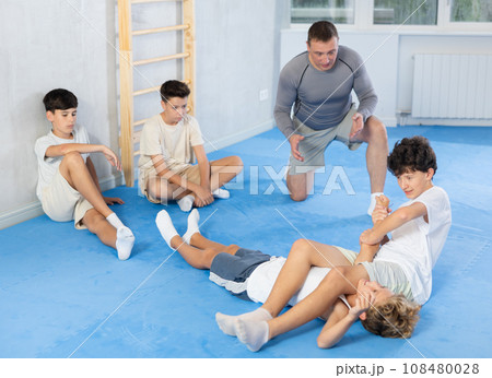 Teenagers practicing armbar in simulated sparring during self-defense training