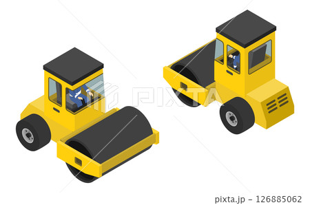アイソメトリックイラスト:スチームローラーを操縦する人