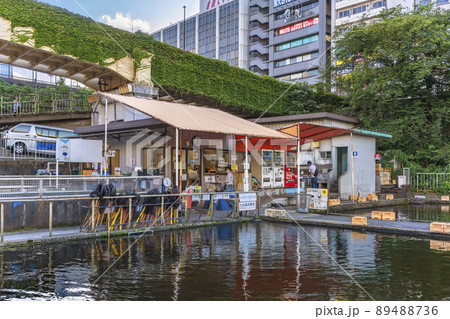 [東京・市ヶ谷] 外堀の神田川の市ヶ谷フィッシュセンターで置いてるたも網、釣り坊と座るためのコンテナ