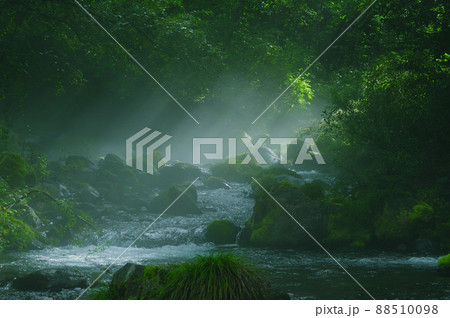 もやのかかった木曽川水系の渓流(手前岩あり)