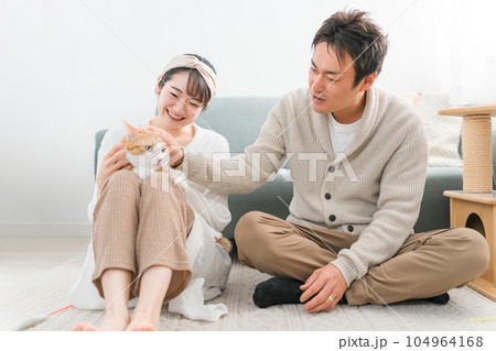猫じゃらしでペットの猫と遊ぶ飼い主の夫婦・カップル(譲渡会・ペットショップ)