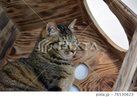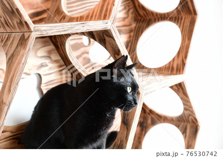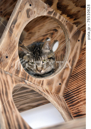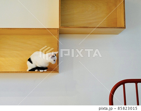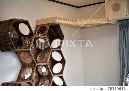 猫の遊び場。キャットタワー、キャットウォーキング、猫と人の住まい。猫との暮らしイメージ素材
