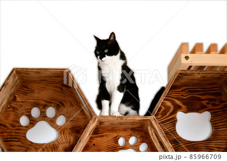 猫の遊び場と猫。キャットタワー、キャットウォーキング、猫と人の住まい。猫との暮らしイメージ素材
