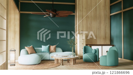 Mocha concept Scene living room have green sofa and decoration wooden minimalist design, room japanese style.