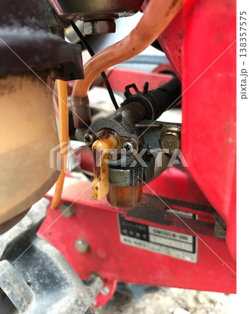 農機具のキャブレターと燃料コック・錆びた整備部品の写真