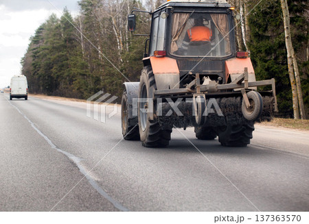 Orange tractor with road cleaning brush attachment working on paved highway during day. Vehicle with driver performing maintenance on asphalt surface near forest line. Copy space for text