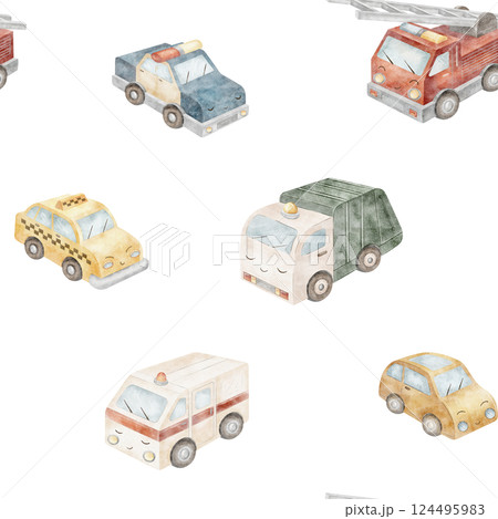 Watercolor pattern city cars police, taxi, fire truck, garbage truck, ambulance. Seamless print children's transport. Illustration background for design, fabric, baby clothes, textile, cards wallpaper