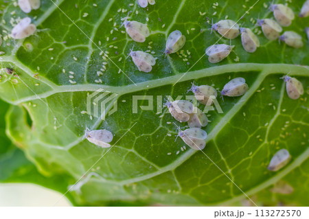 Underside of plants leaves with pest Cabbage Whitefly Aleyrodes proletella adults and larvae on the underside of the leaf. Itis a species of whitefly from the Aleyrodidae family, pest of many crops